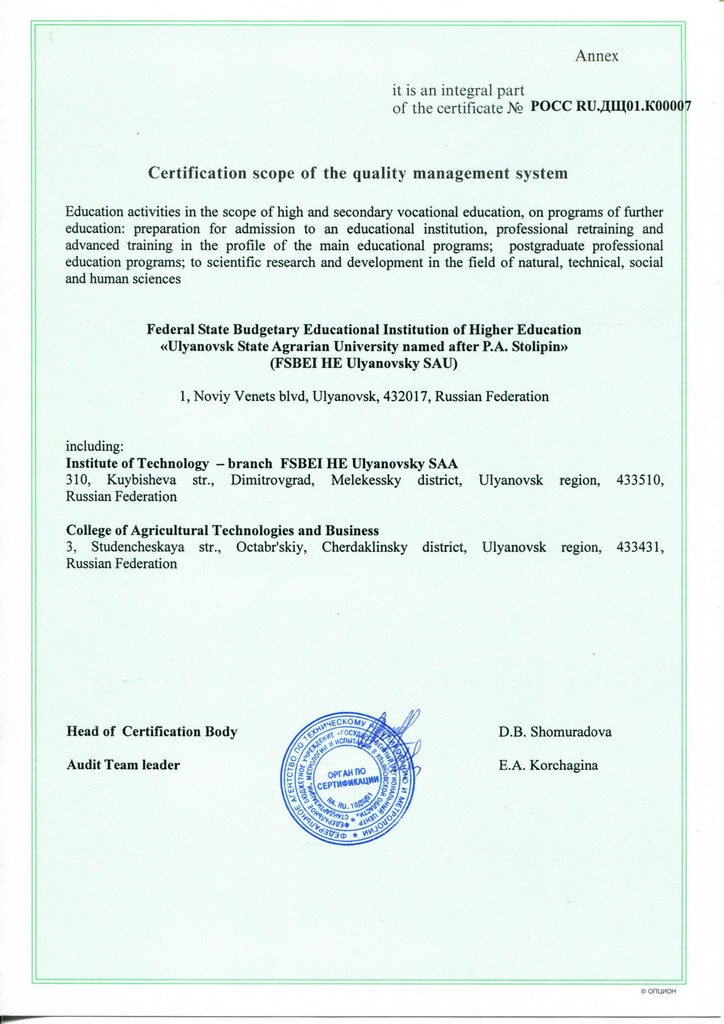 Данный сертификат удостоверяет, что система менеджмента качества применительно к образовательной деятельности в области высшего и среднего профессионального образования, по программам дополнительного образования: подготовка к поступлению в образовательное учреждение, профессиональная переподготовка и повышение квалификации по профилю основных образовательных программ; по программам послевузовского профессионального образования; к научно-исследовательской и научно-методической деятельности соответствует требованиям ГОСТ Р ИСО 9001-2008 (ИСО 9001:2008), регистрационный номер РОСС RU.ИК 86.К00028. Этот сертификат соответствия требованиям ГОСТ Р ИСО 9001-2008 мы получили первыми среди высших учебных заведений г. Ульяновск.