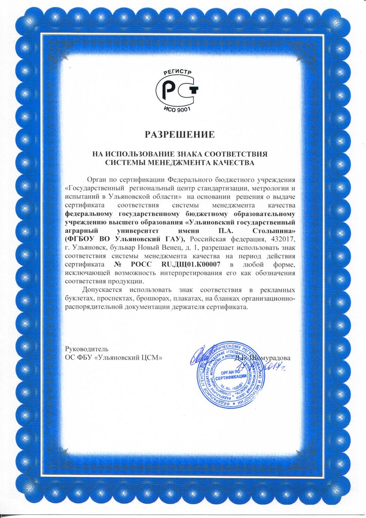 7 декабря 2018 года ФГБОУ ВО Ульяновский ГАУ подтвердил действие сертификата соответствия СМК требованиям ГОСТ Р ИСО 9001-2015 (ISO 9001:2015), регистрационный номер №РОСС RU.ДЩ01.К00007.
